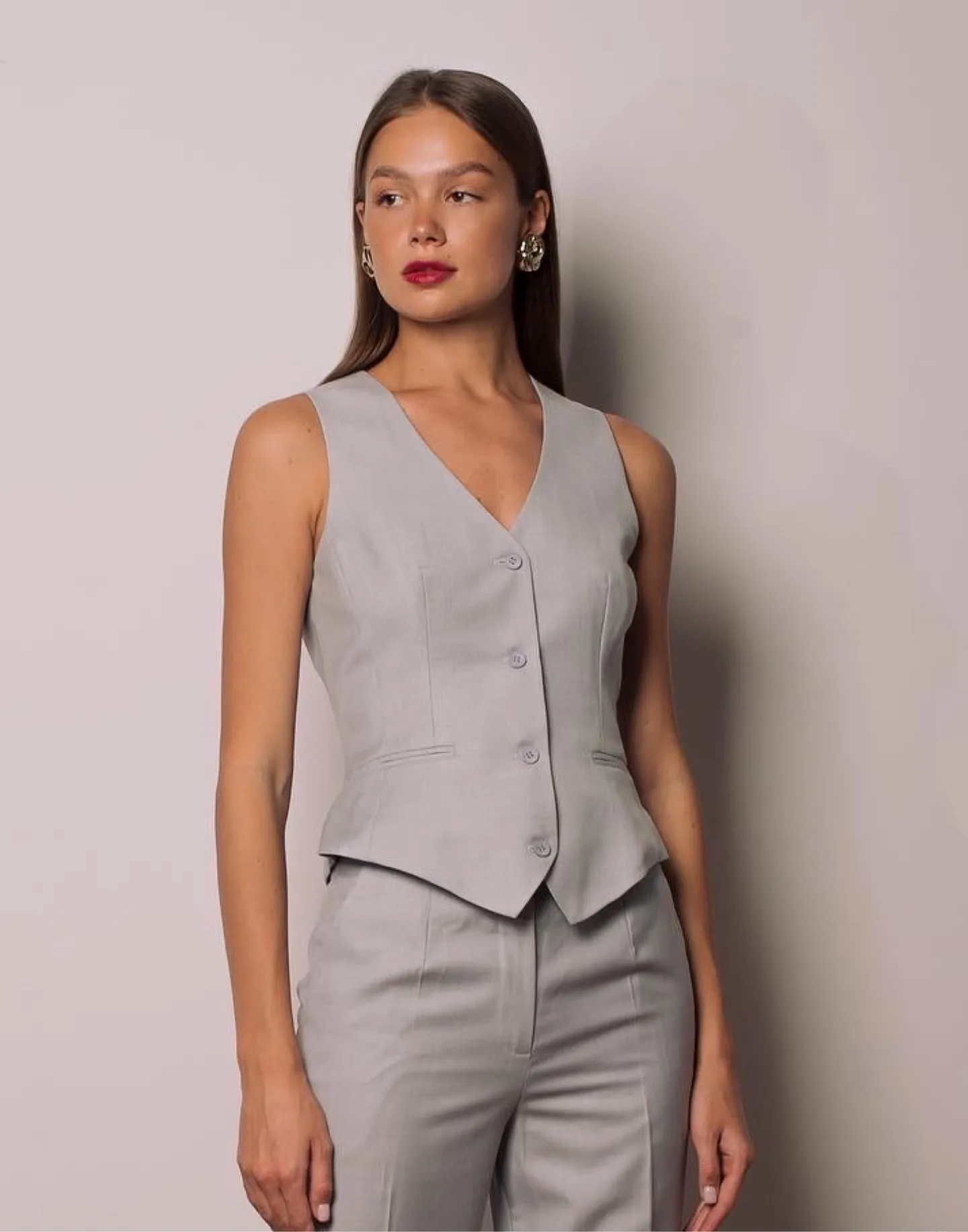 Серый цвет добавляет универсальности и позволяет легко сочетать костюм с другими элементами гардероба. Тройка состоит из пиджака, брюк и жилетки, что придает ему структурированный и современный вид. Пиджак имеет элегантный свободный крой и универсальную посадку на любой тип фигуры и сочетает в себе минимализм и smart-сексуальность.